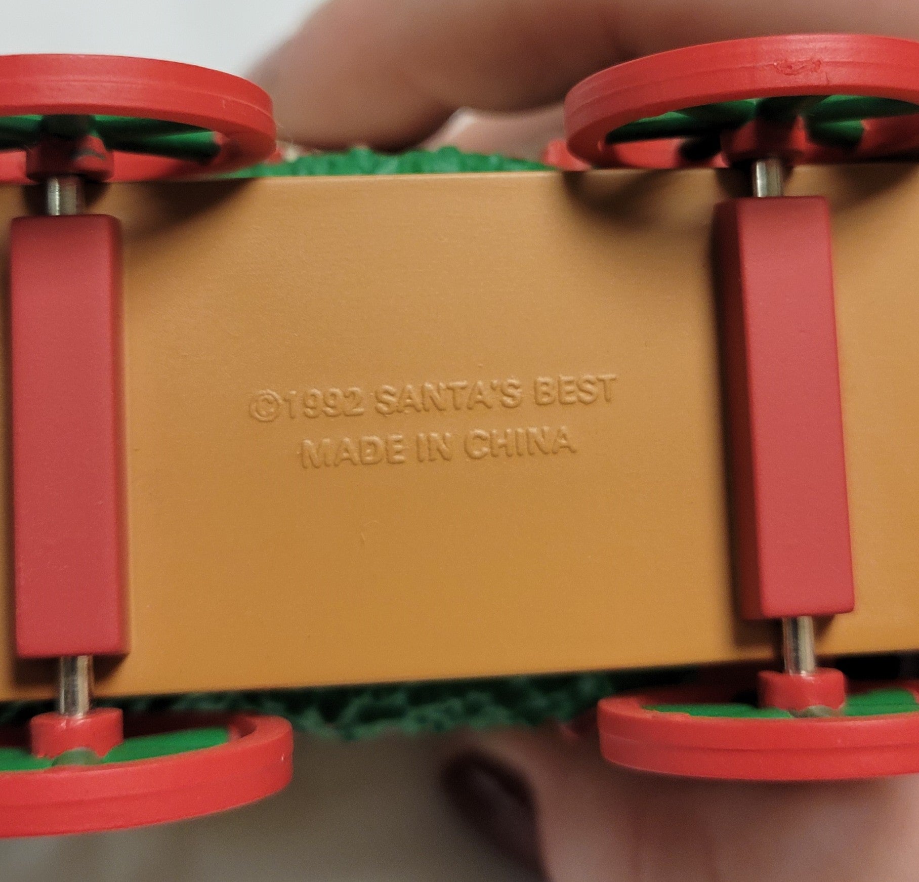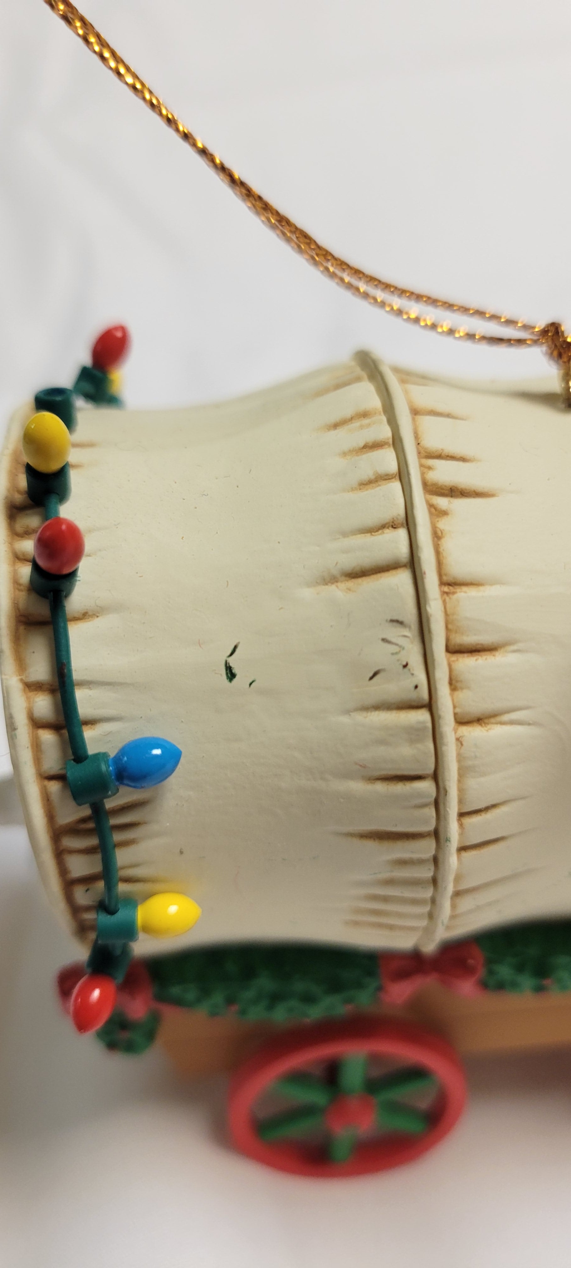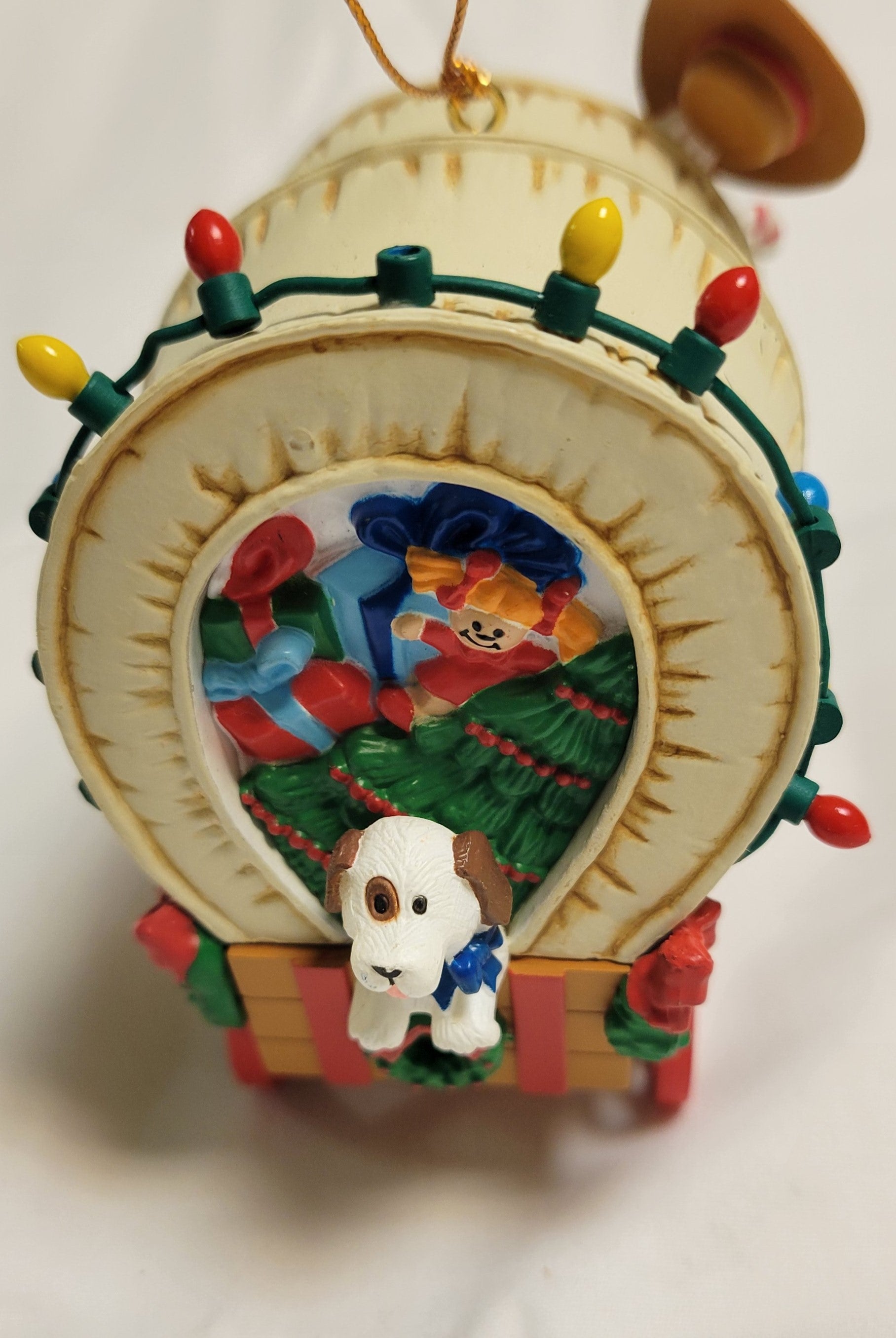 This great vintage Christmas tree ornament traveled from 1992 to come to your tree this year! Santa and presents on bench are removeable. Will package them separately and you can glue them on or leave them removeable. Cute Dog peeks out the back of this covered wagon full of presents. A few small scratches on the top but that adds to the charm of this 30 year old decorative item.