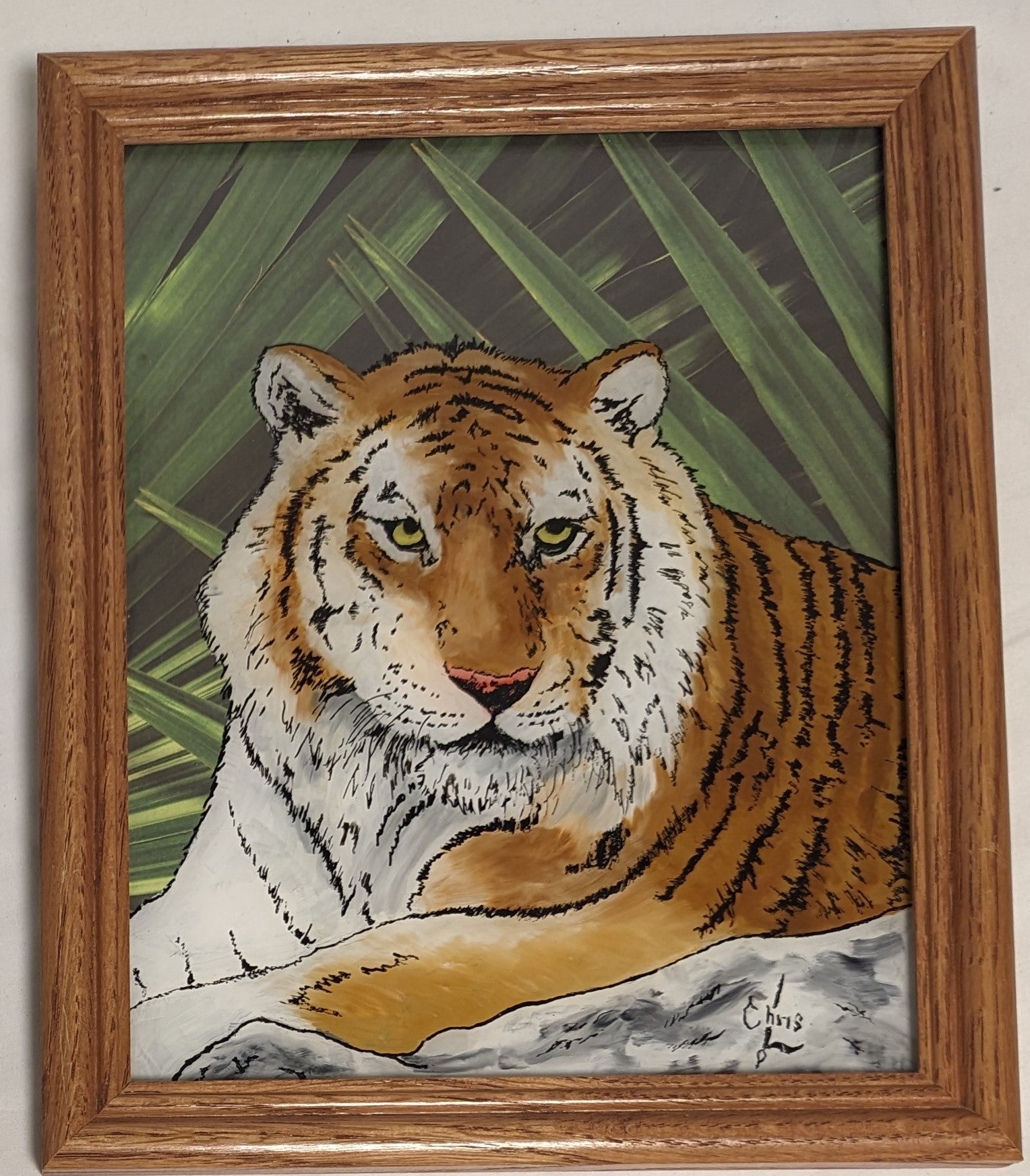 Art By Hand Painted on glass backward " Tiger " over palm background photo in frame under glass