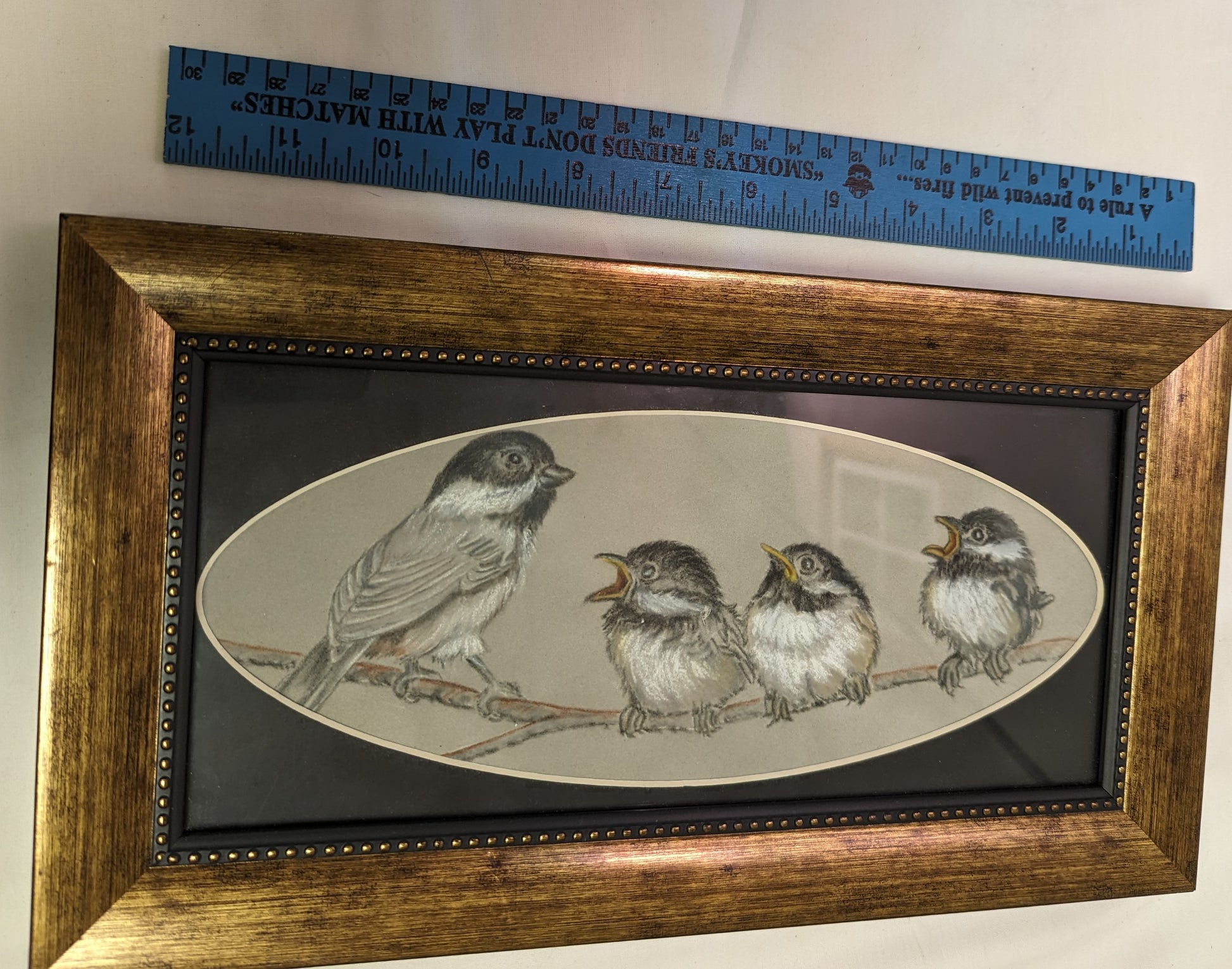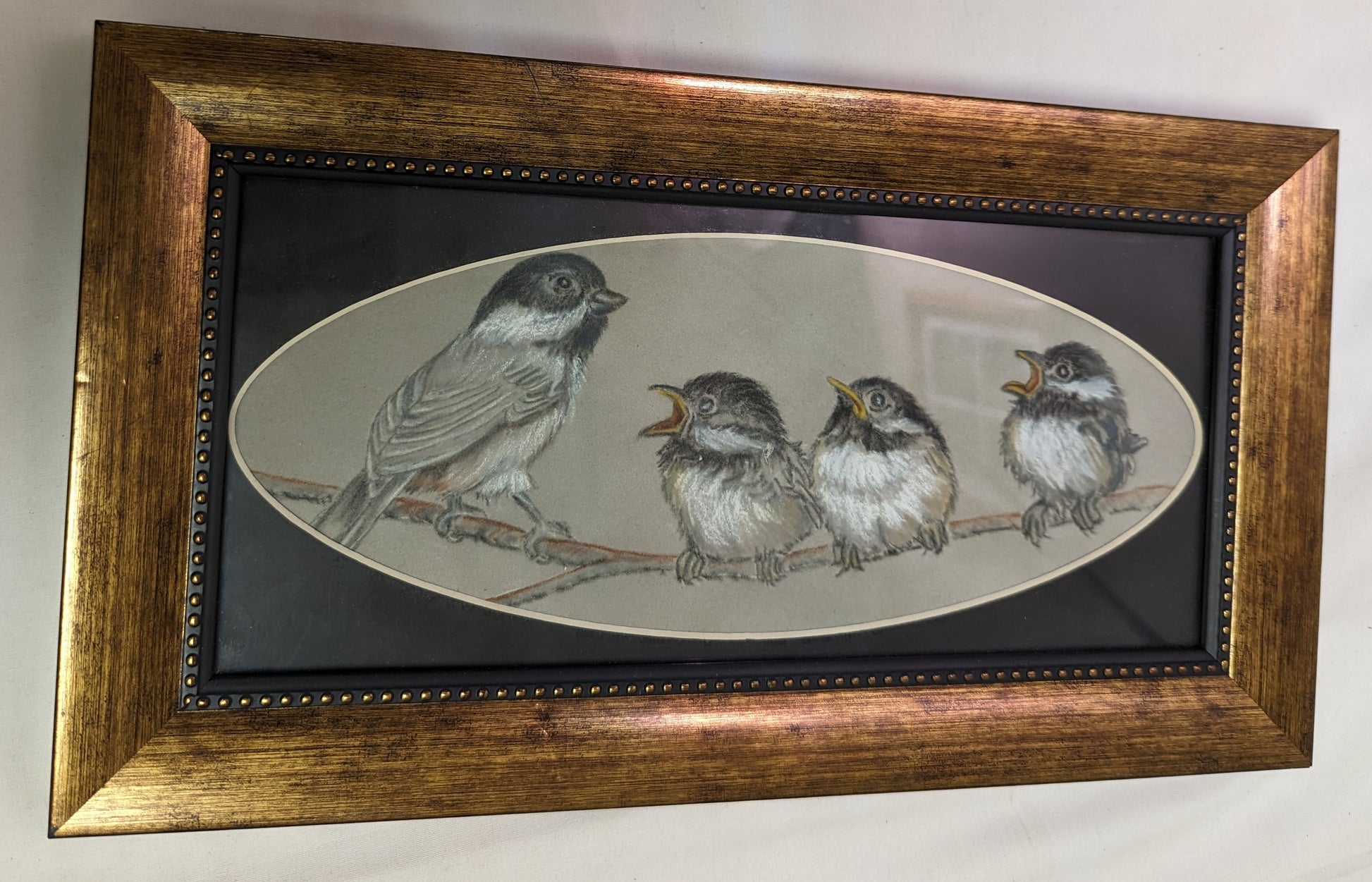 Art Framed Painted Black Capped Chickadee and three Little Chicks on paper