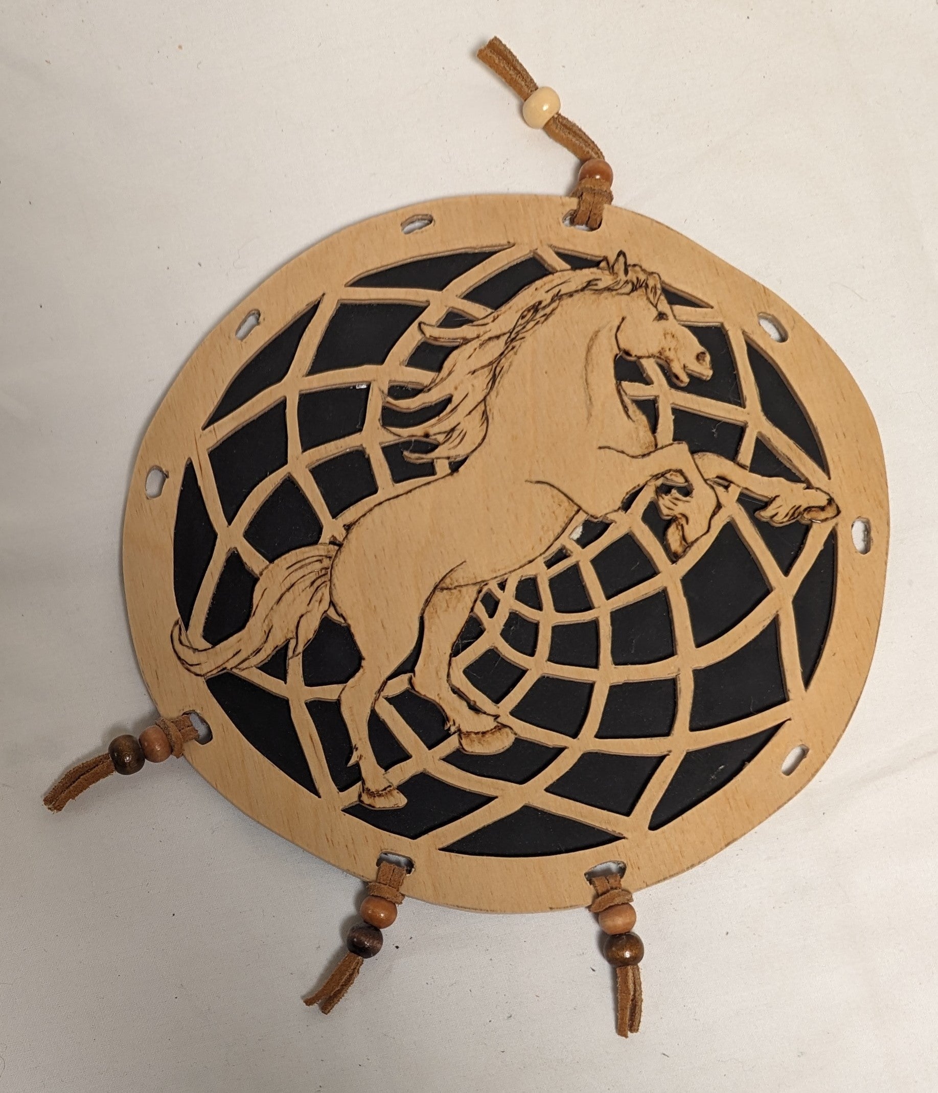 Art Hand Made Vintage Scroll Sawn Dreancatcher wood cutout "Stallion" Credited and Autographed