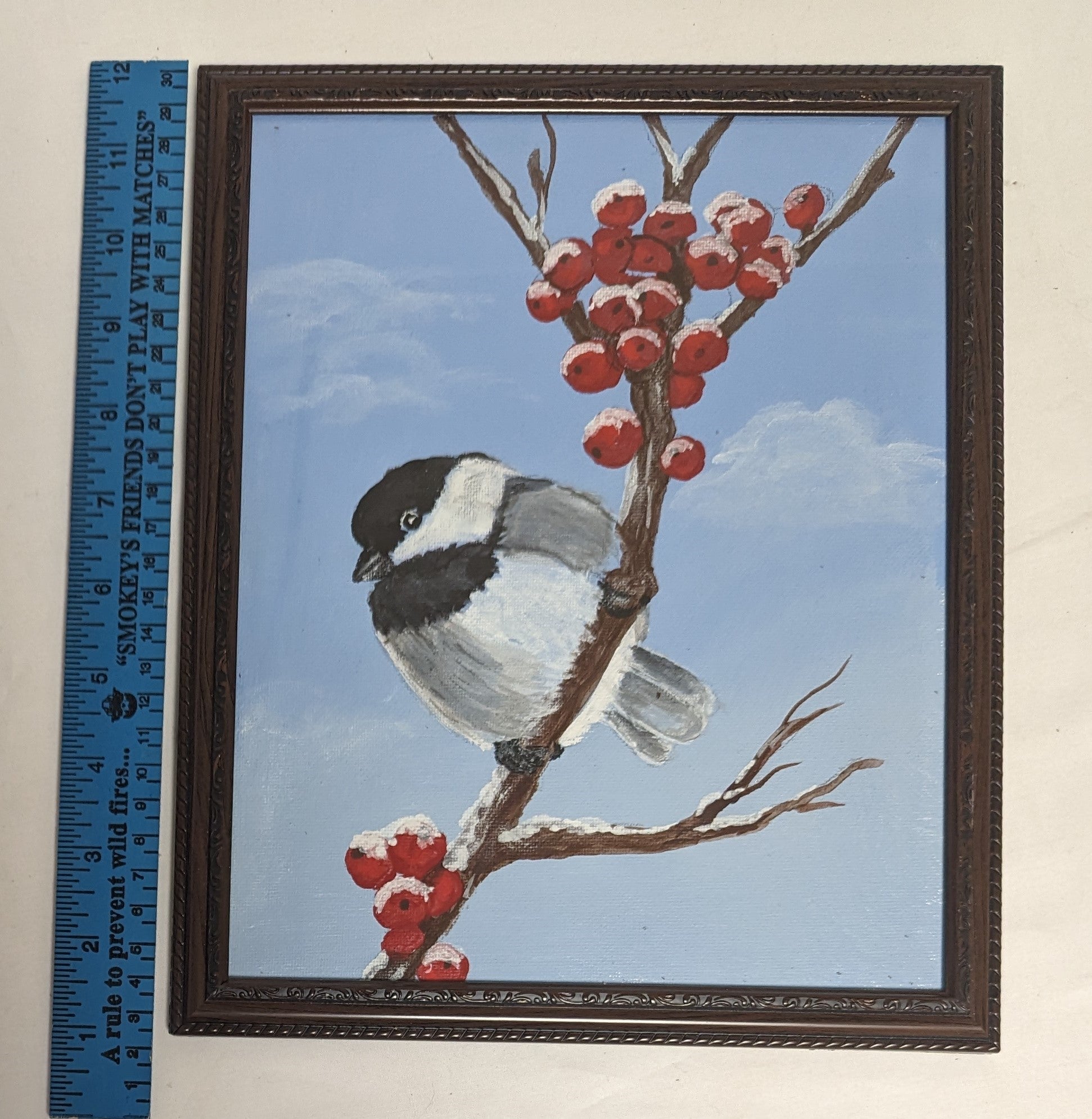 Art Hand Painted on Canvas board in frame under glass " Chickadee in Red Berries"