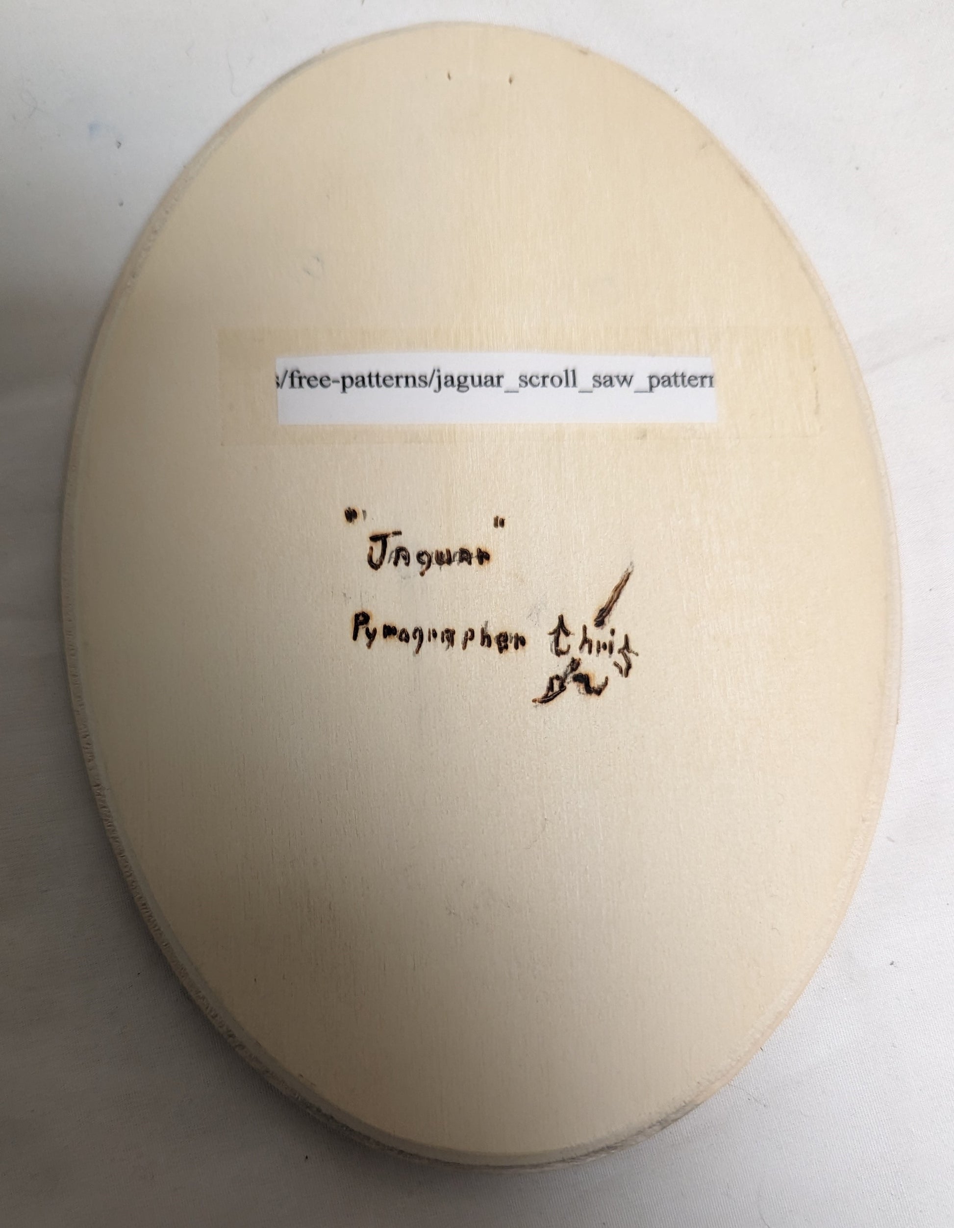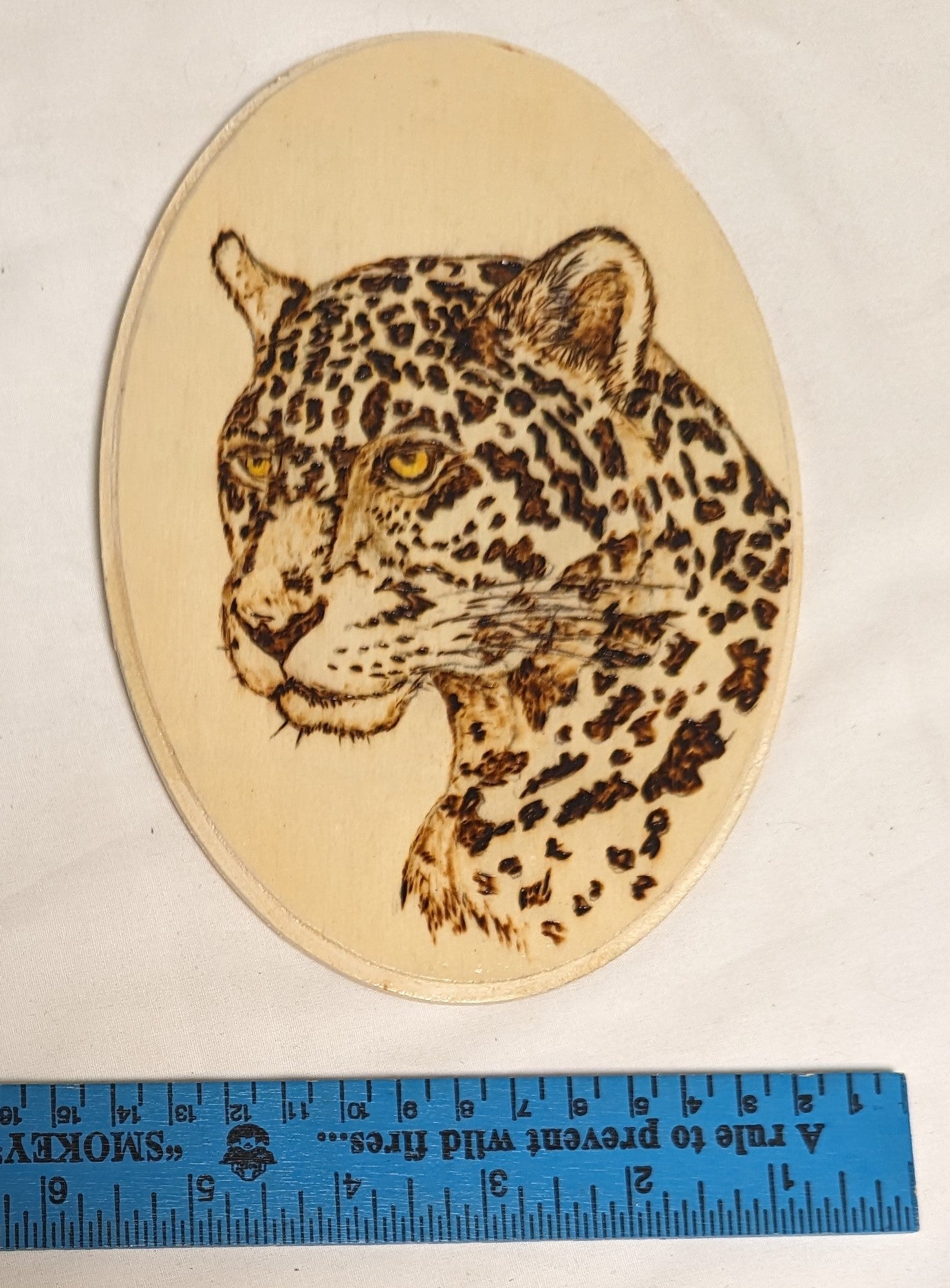 Art Hand Pyrography on Oval wood " Leopard Face" Credited and Autographed