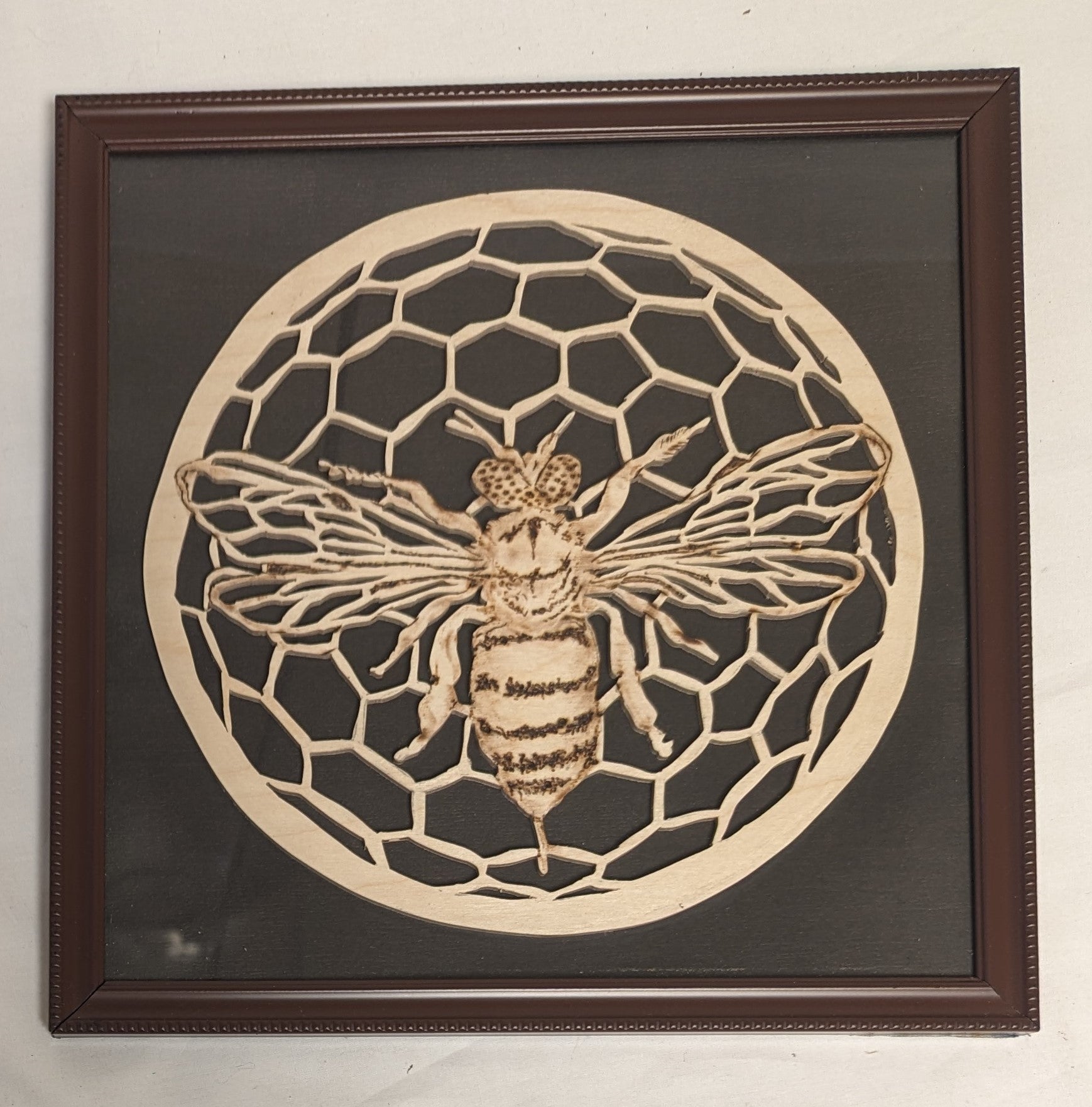 Art Hand Scroll Sawn Delicate "Bee on Comb" Emblem in frame under glass