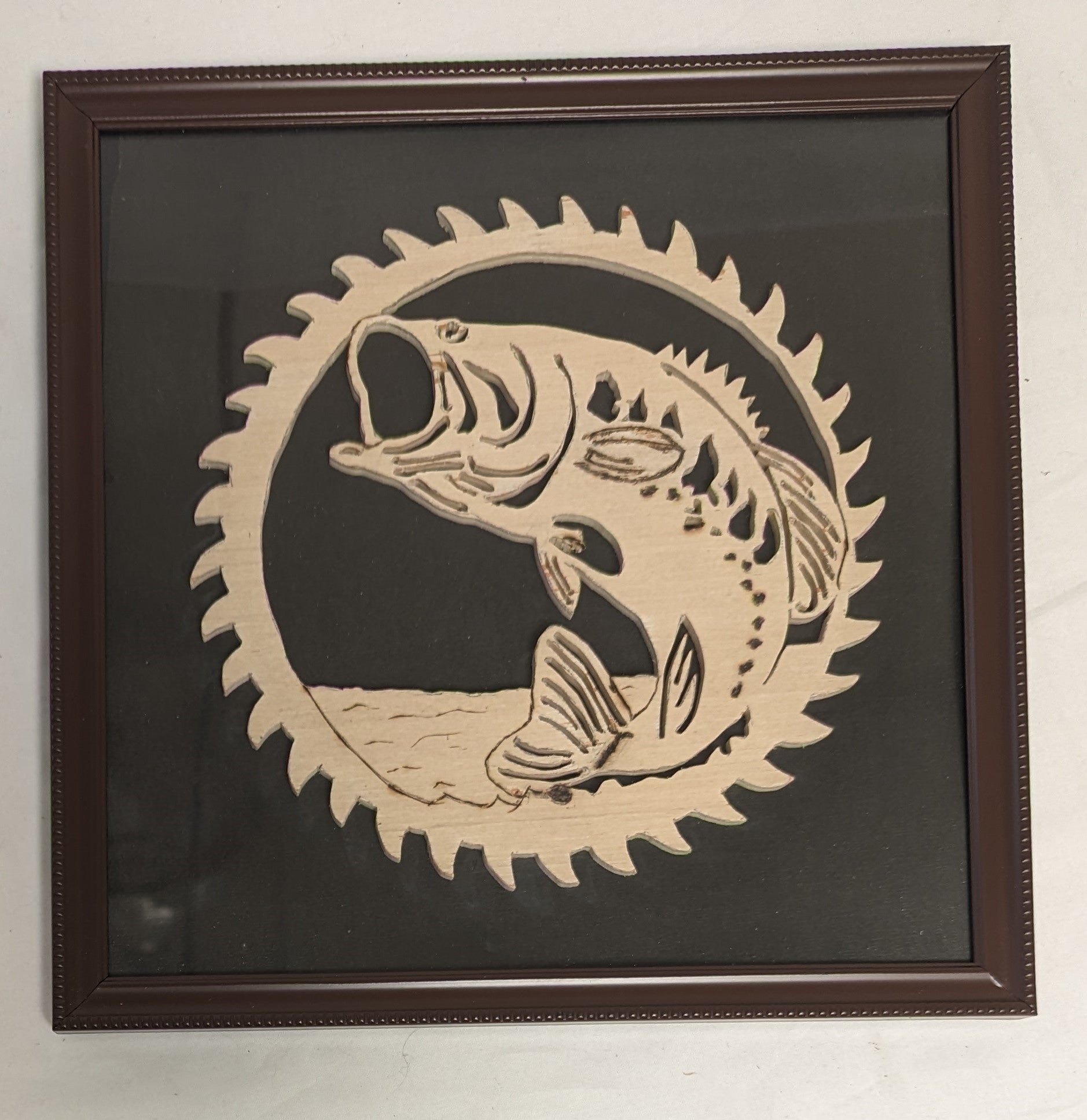 Art Hand Scroll Sawn Delicate "Large Mouth Bass" Sawblade Emblem" in frame under glass
