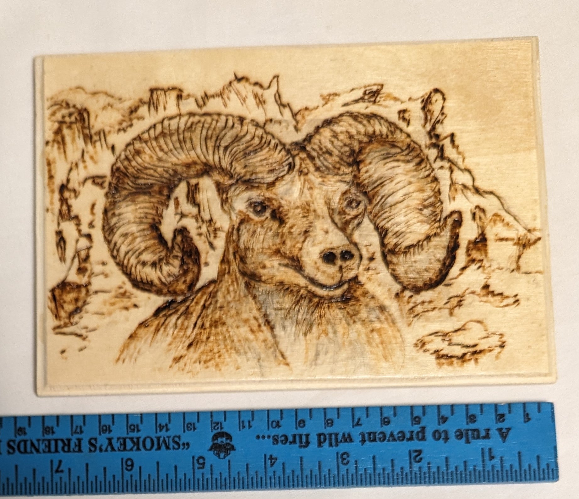 Art Handmade Pyrography on wood " Big Horned Sheep" Signed