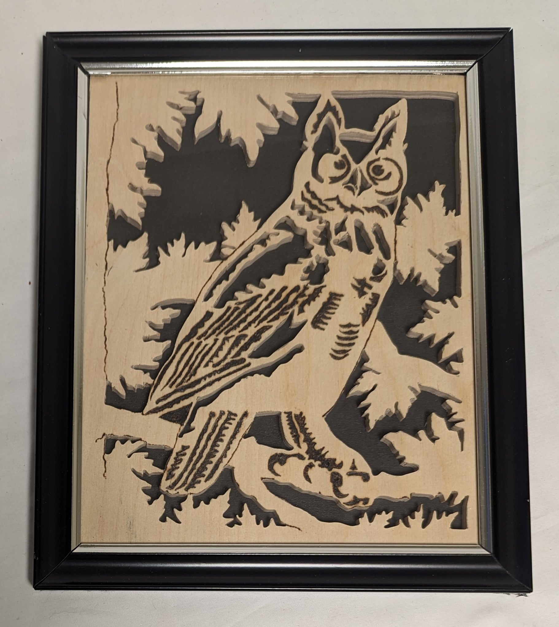 Art Handmade Scroll sawn Pyrography on wood " Owl in Tree" in frame under glass.