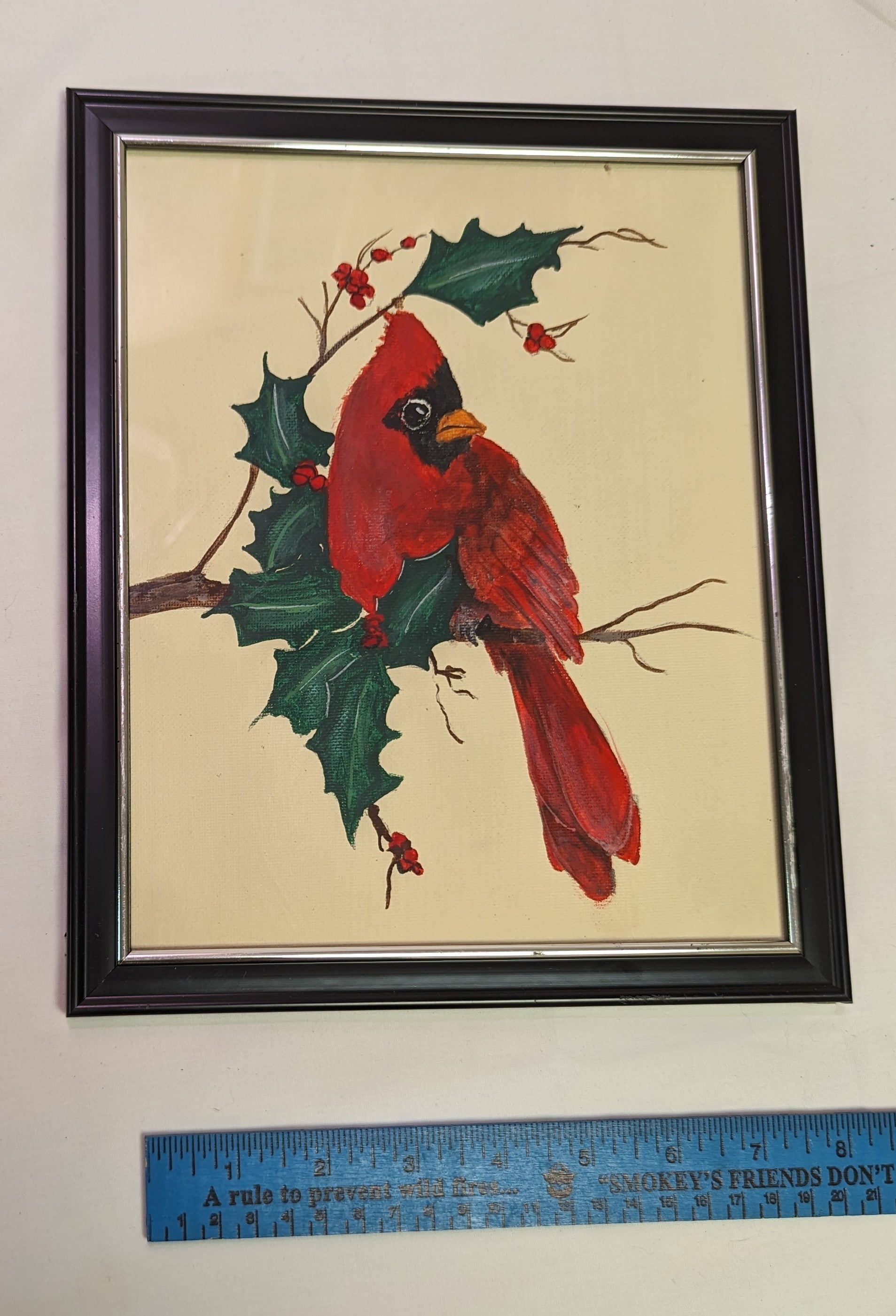 Art Painting Acrylic Redbird Cardinal on Holly Branch on Canvas Board in Frame