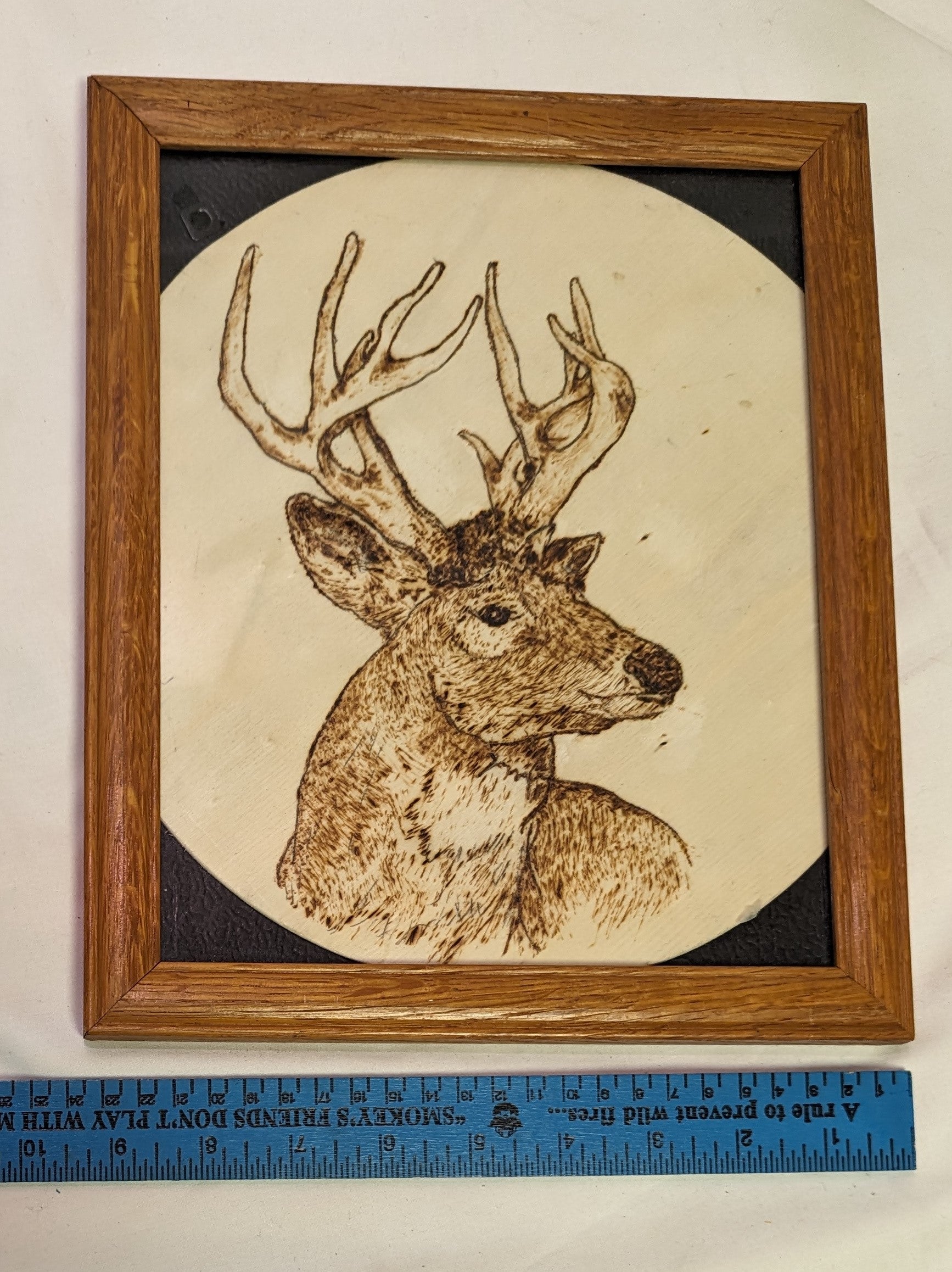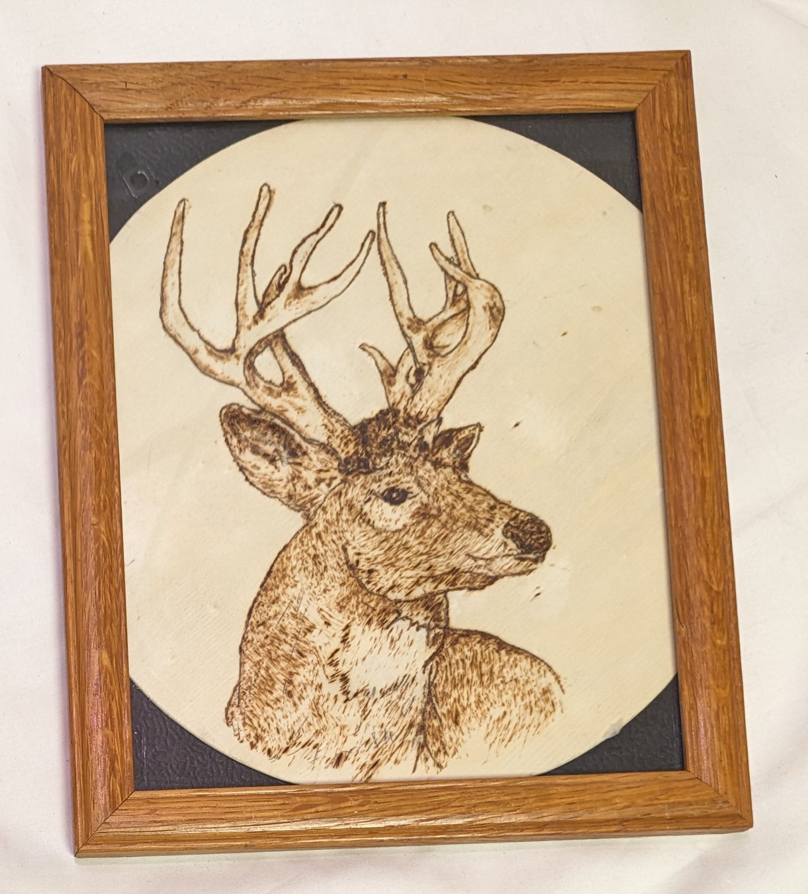Art Pyrography on round wood Buck Head in Frame under glass