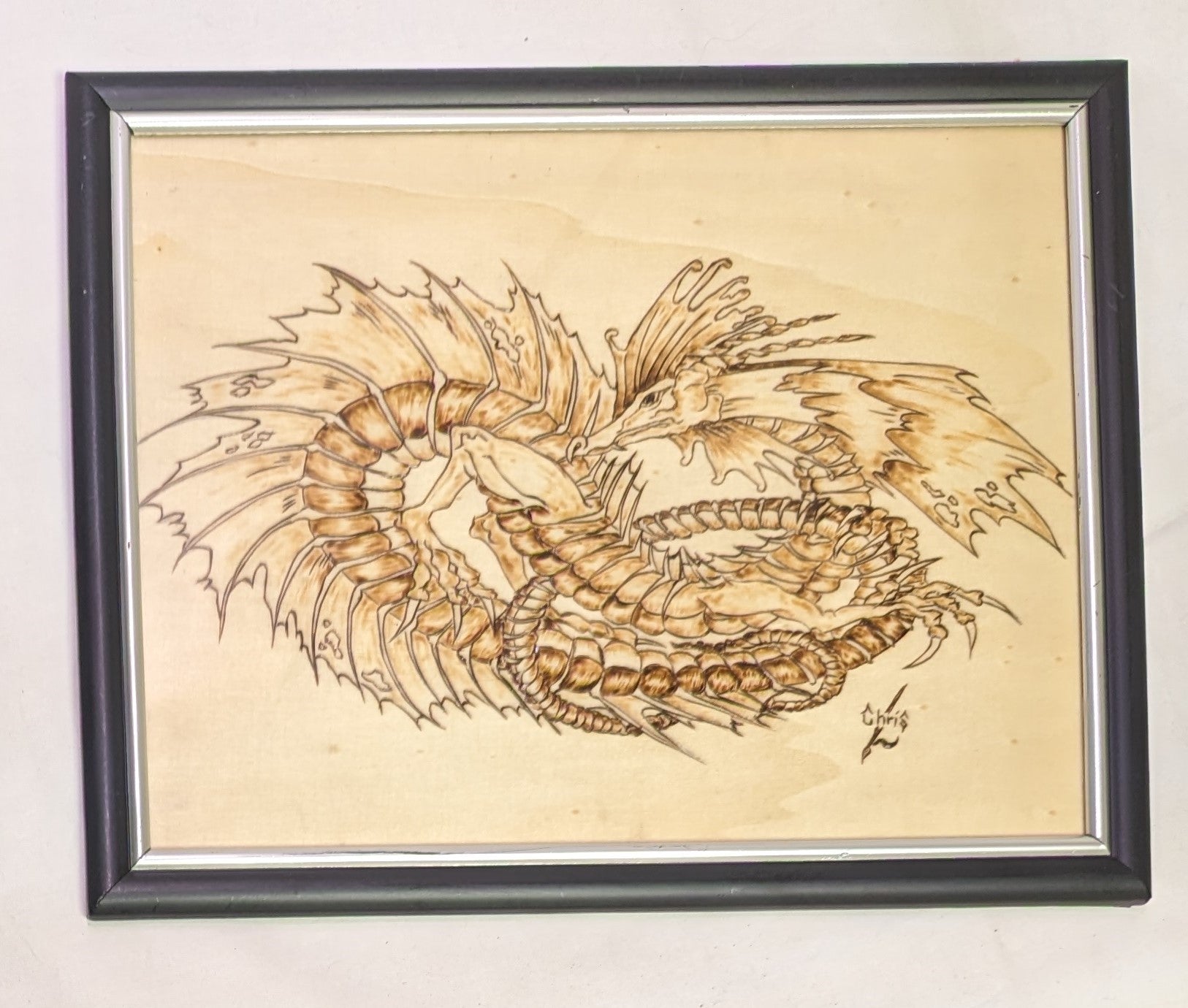 Art Pyrography on wood "Dragon " in frame under glass Autographed