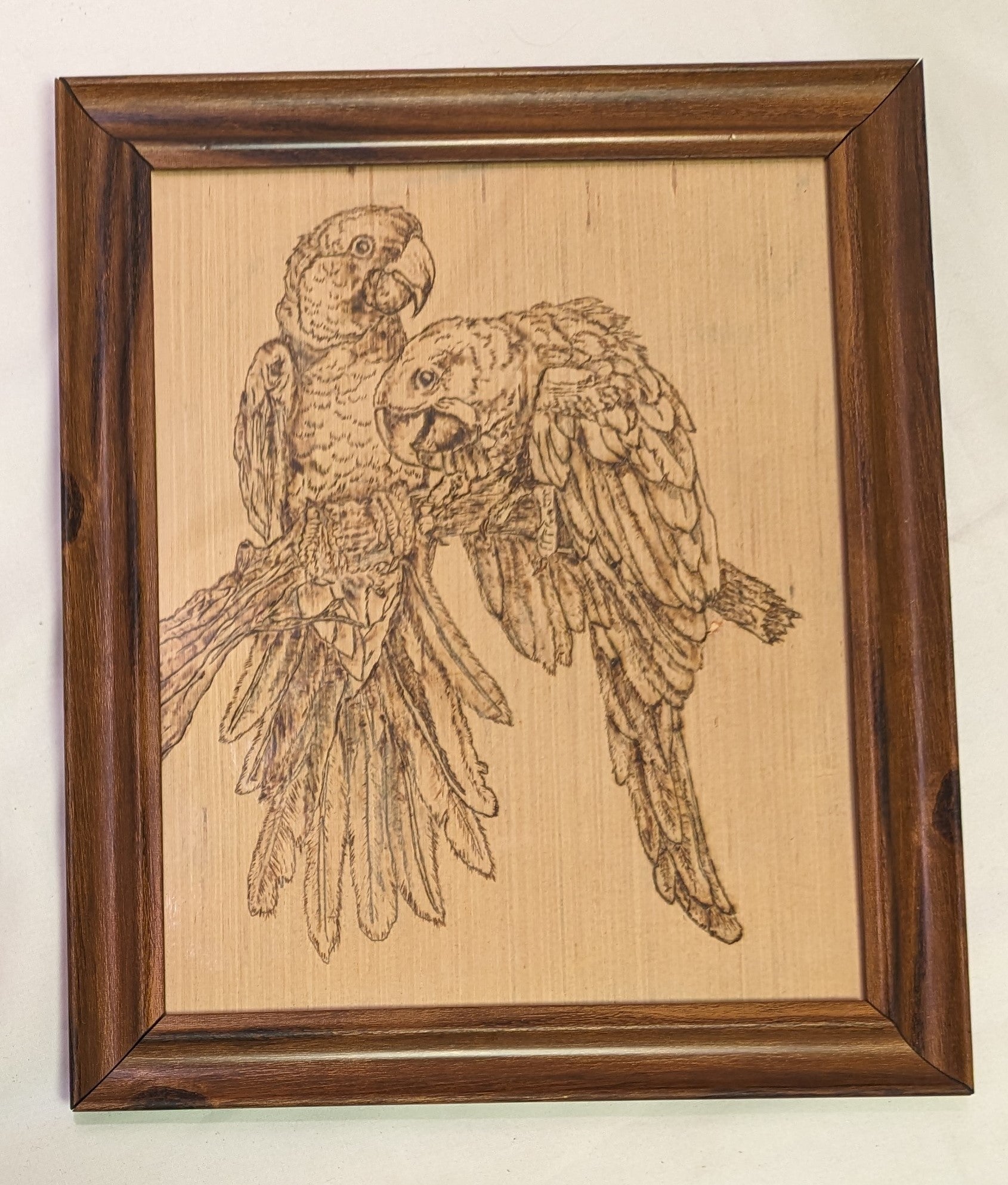 Art Pyrography on wood Maccaws on branch " in frame under glass