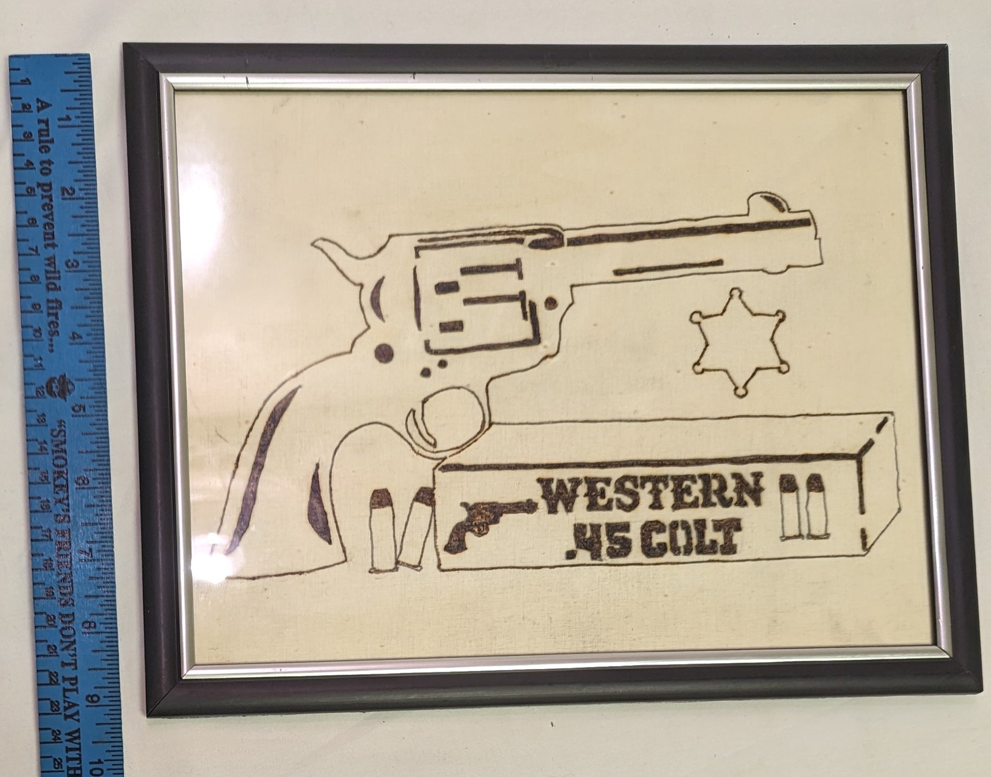Art Pyrography Colt 45 Pistol and Shells Emblem on wood in frame under glass