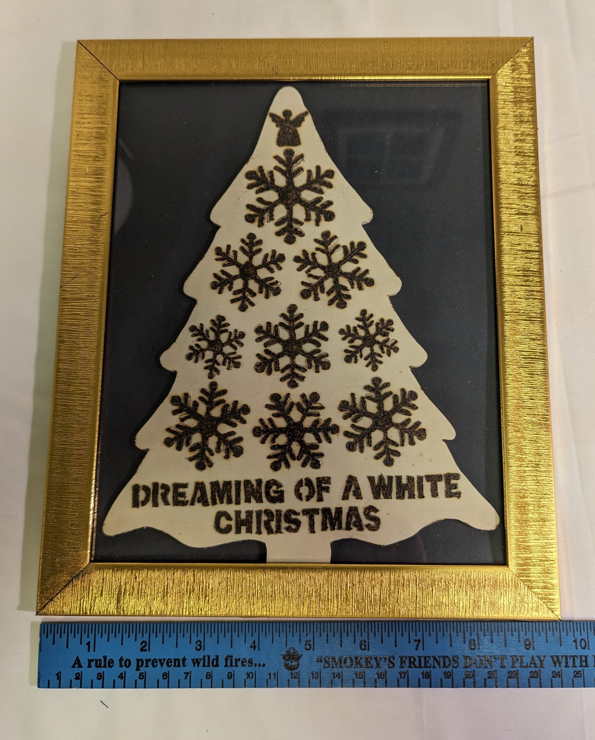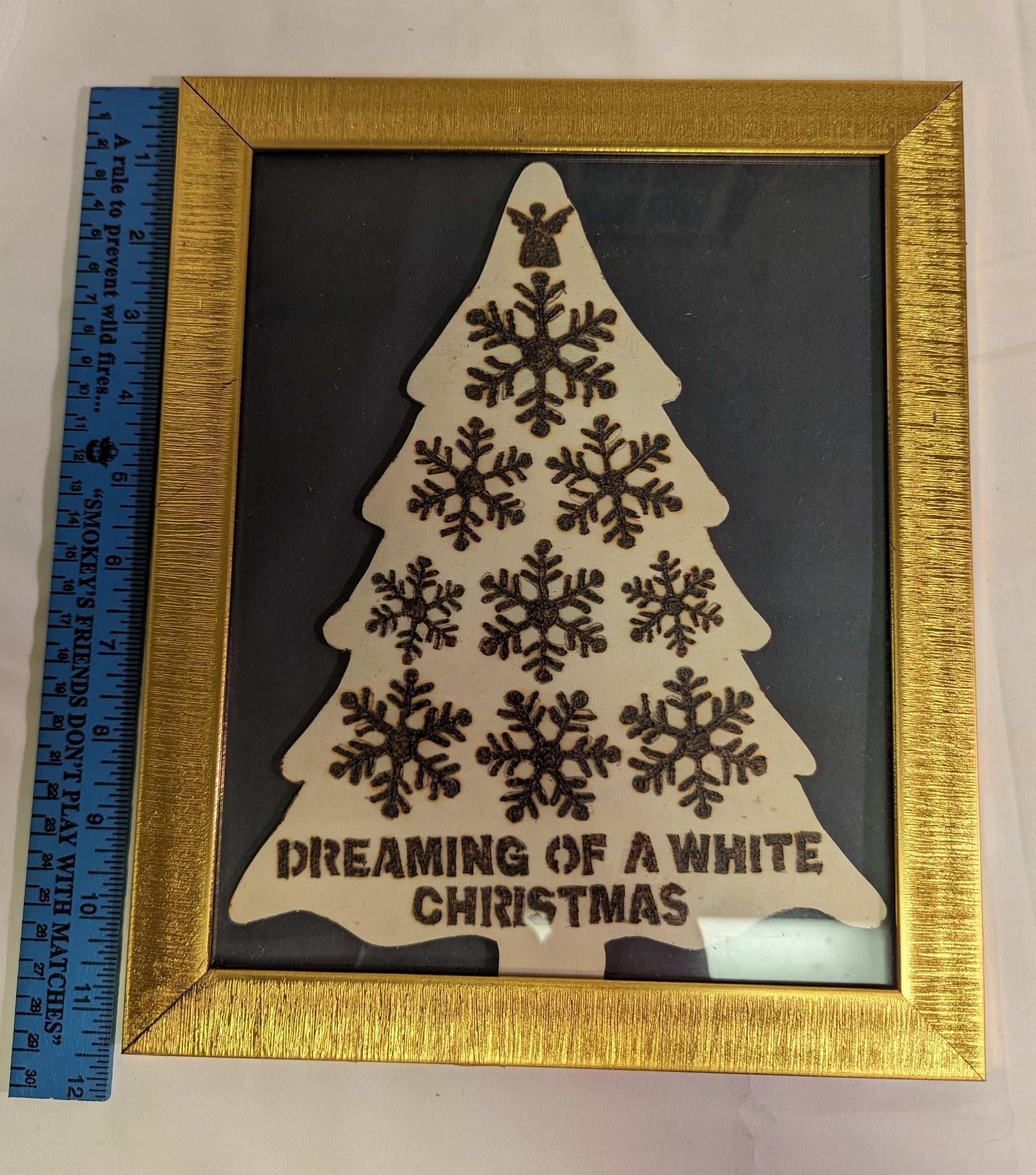 Art Pyrography Scroll Saw Christmas tree Snowflakes "Dreaming of a White Christmas in Frame under Glass