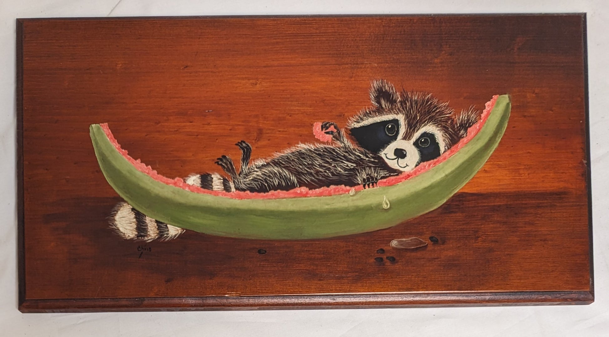 Art Rare Handmade Painting on wood "Racoon in Watermellon" Wall hanging Autographed