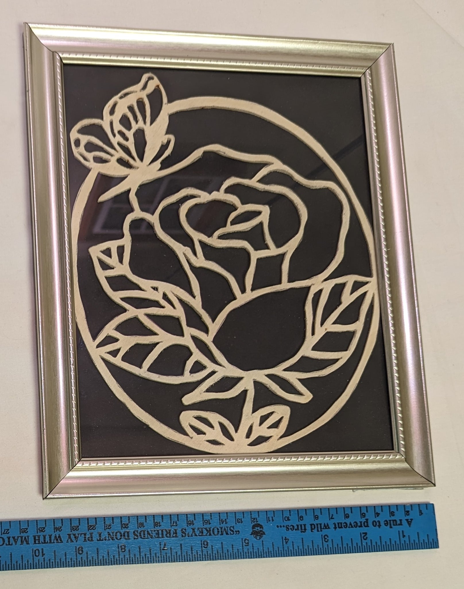 Art Scroll Saw Flower and Butterfly Cut over Black Background in Frame under glass