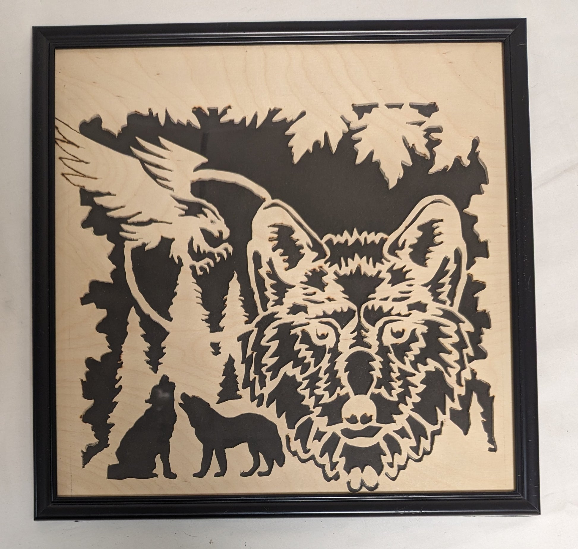 Art Scroll Sawn Cutout Decor Howling Wolves Screaching Eagle in fram under glass