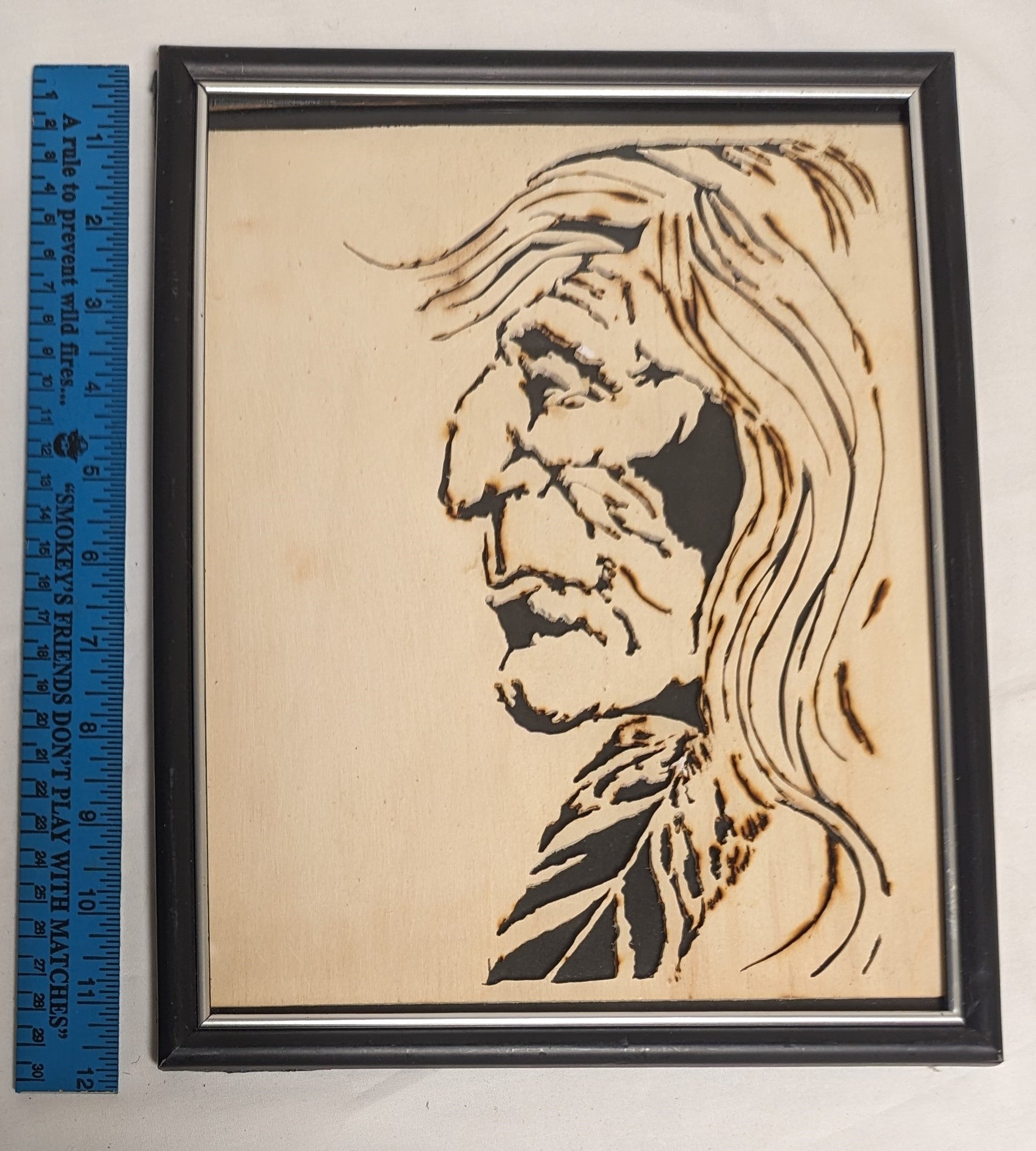 Art Vintage Hand Pyrography on Scroll cut wood " Native American Man Profile" Framed