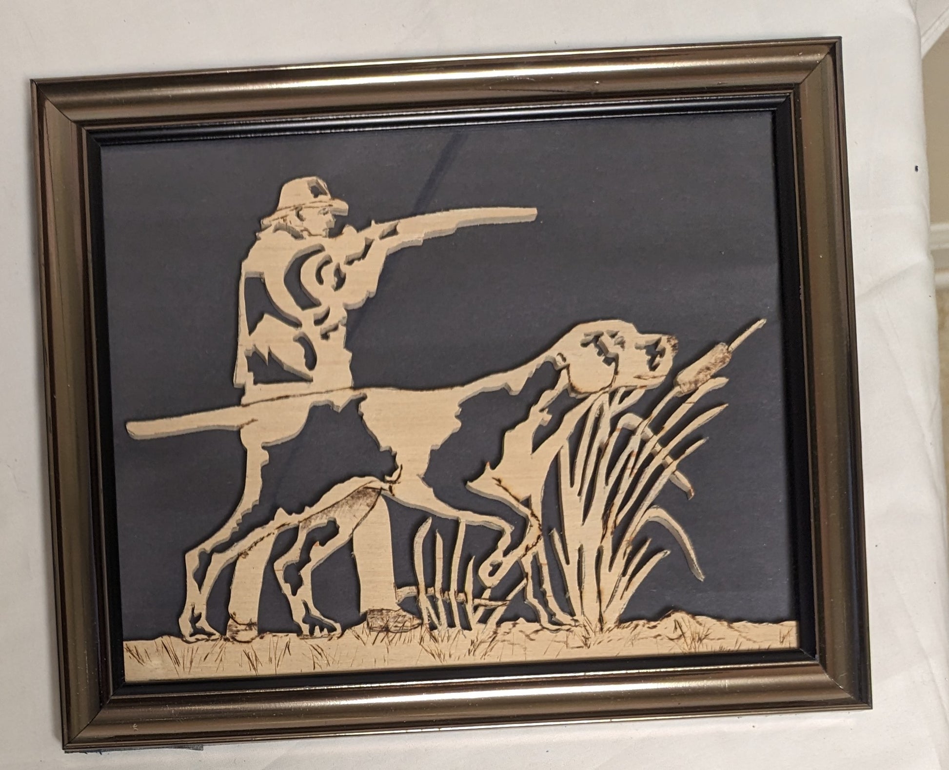 Art Vintage Hand Scroll Saw Cut Out and wood burned " Hunter and Pointer " Framed