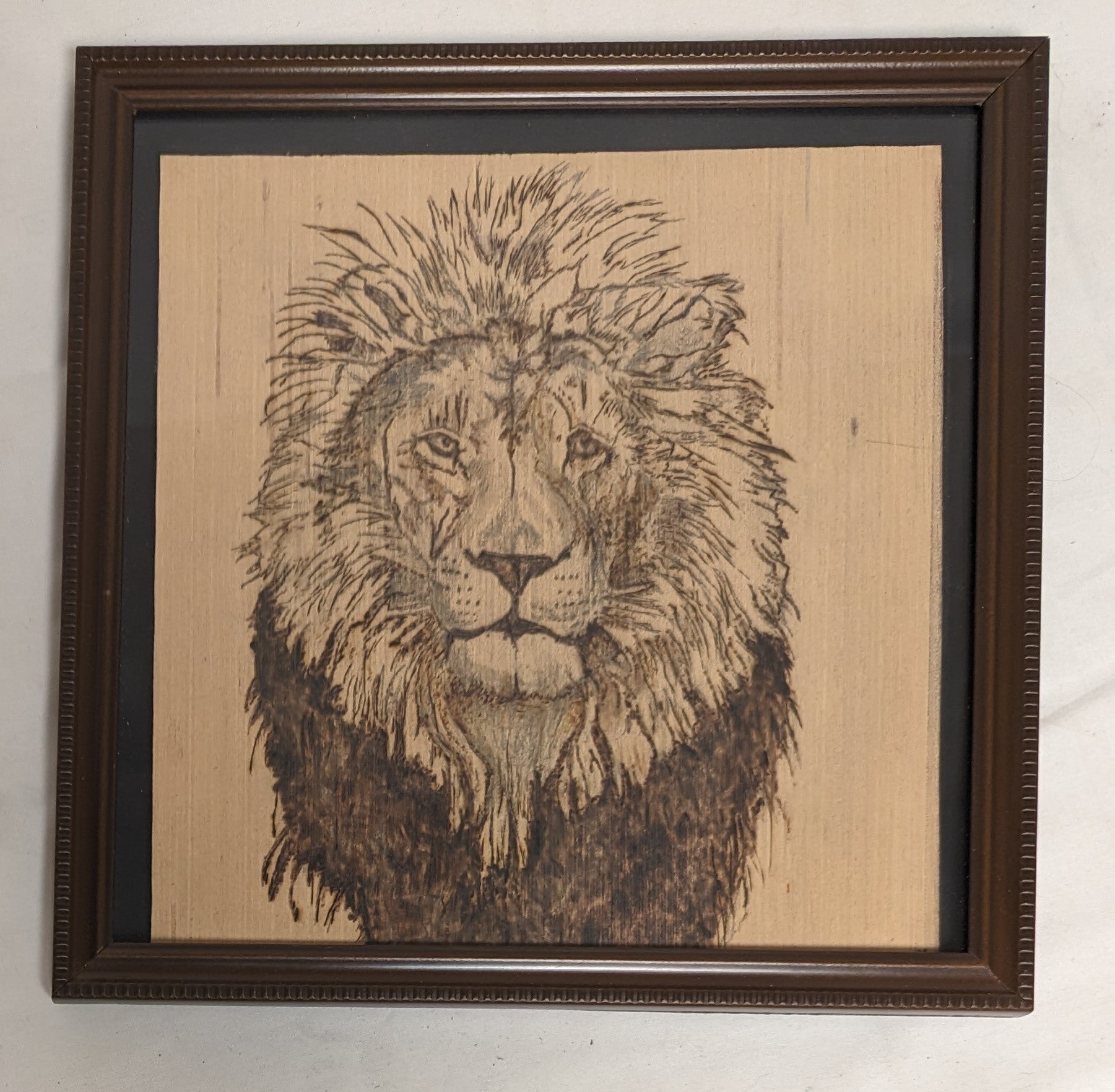 Art Vintage Handmade Pyrography Portrait on wood " Old Lion" in frame under glass