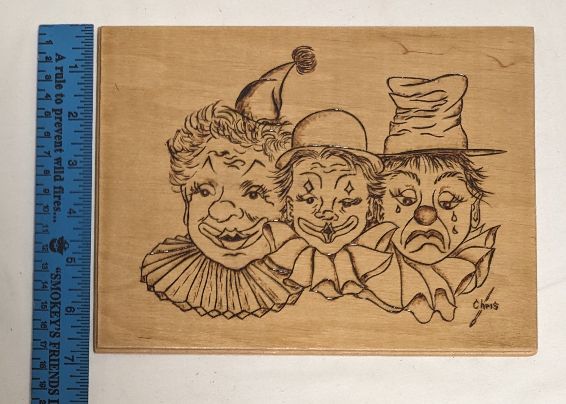 Art Vintage Rare Hand Pyrography on wood " Three Clowns"