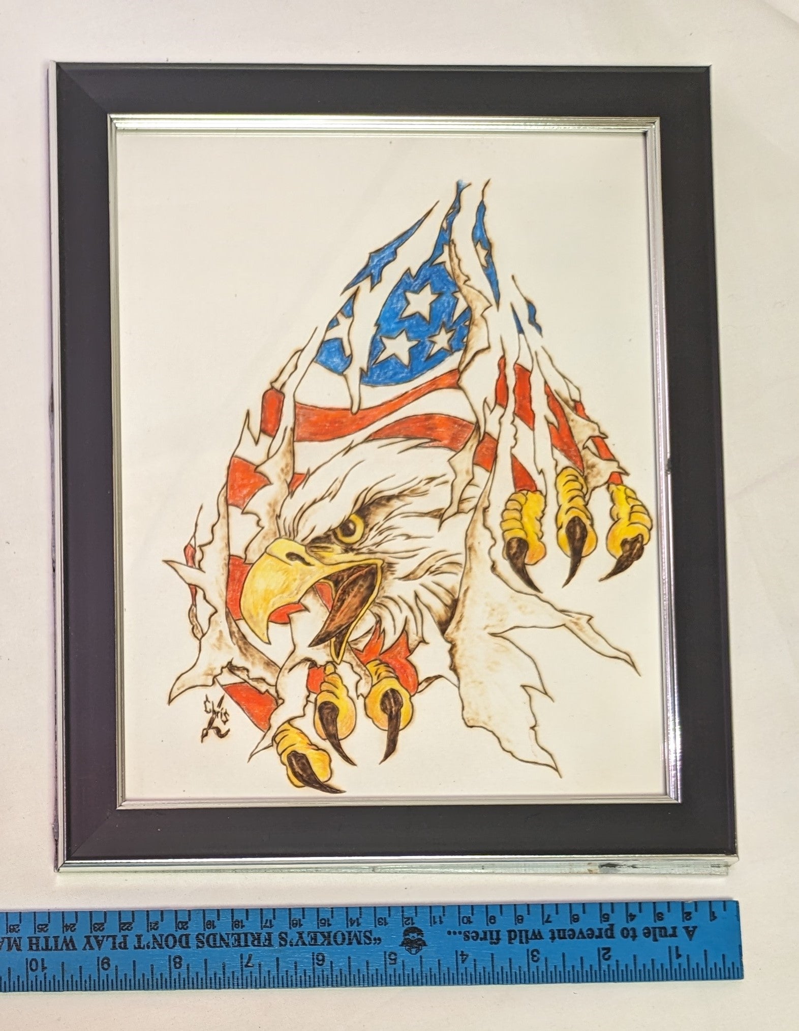 Art Pyrography on colored wood Eagle and American Flag in frame under glass