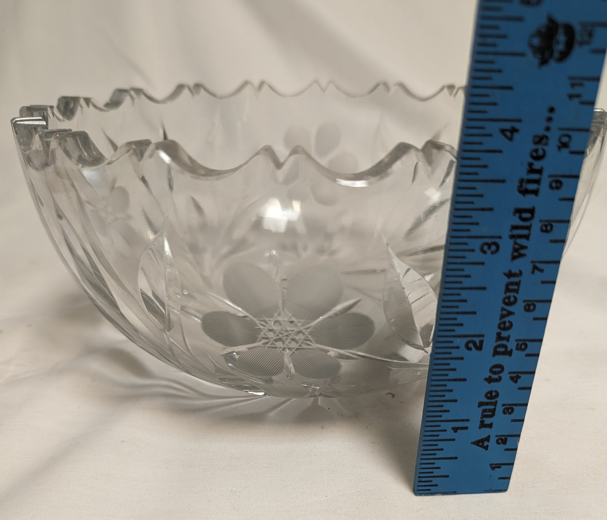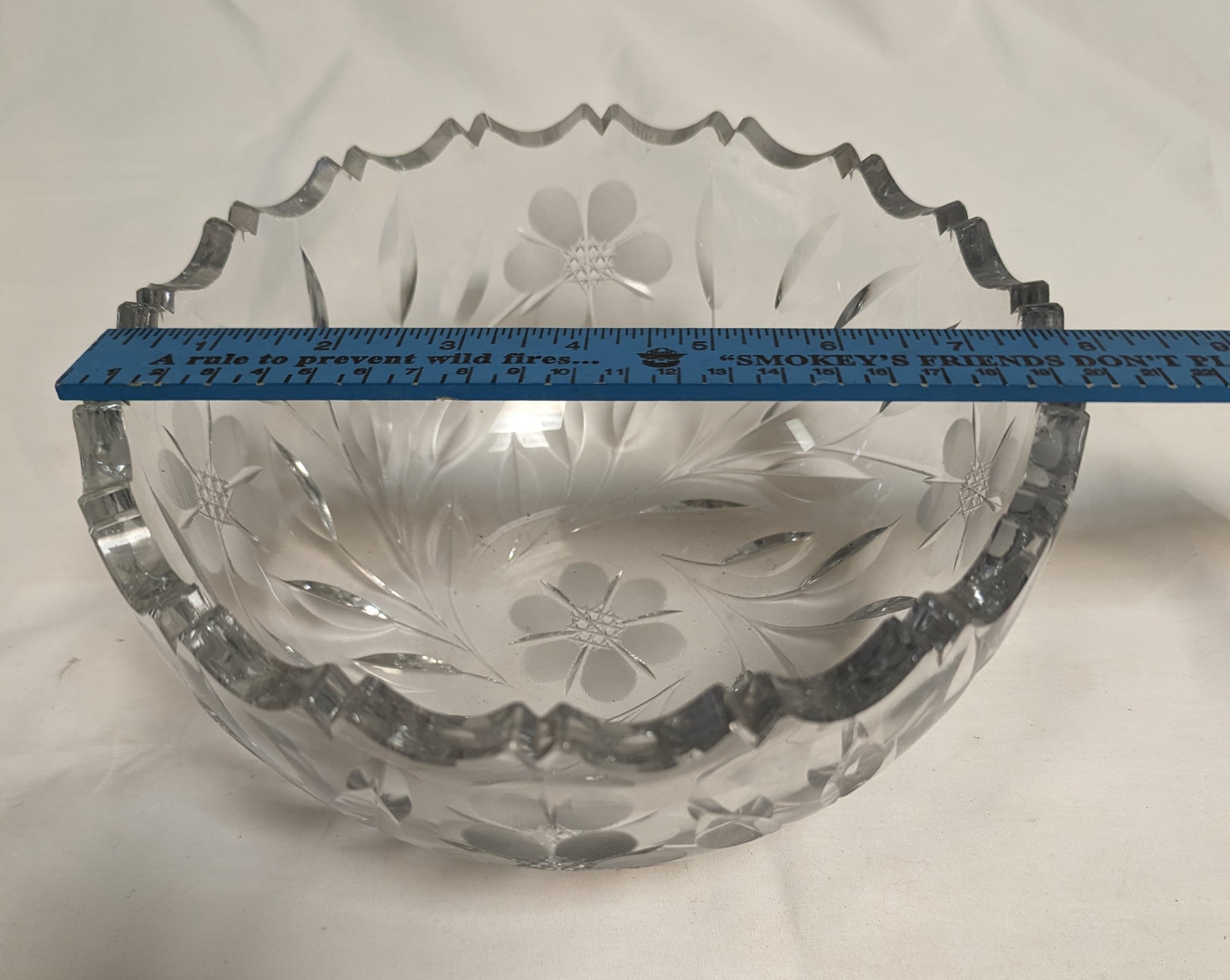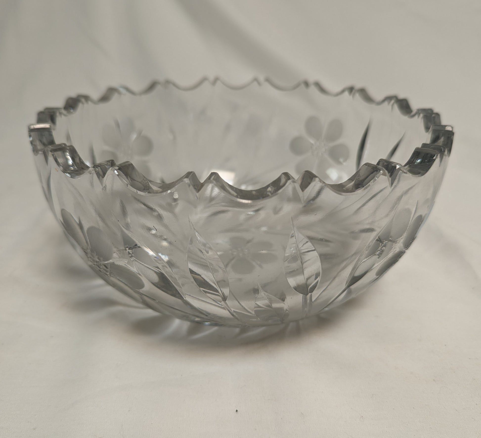 Brilliant APC Heavy Blank Deep Sharpe Etched Cut Spherical Bowl 8" Leaves and flowers