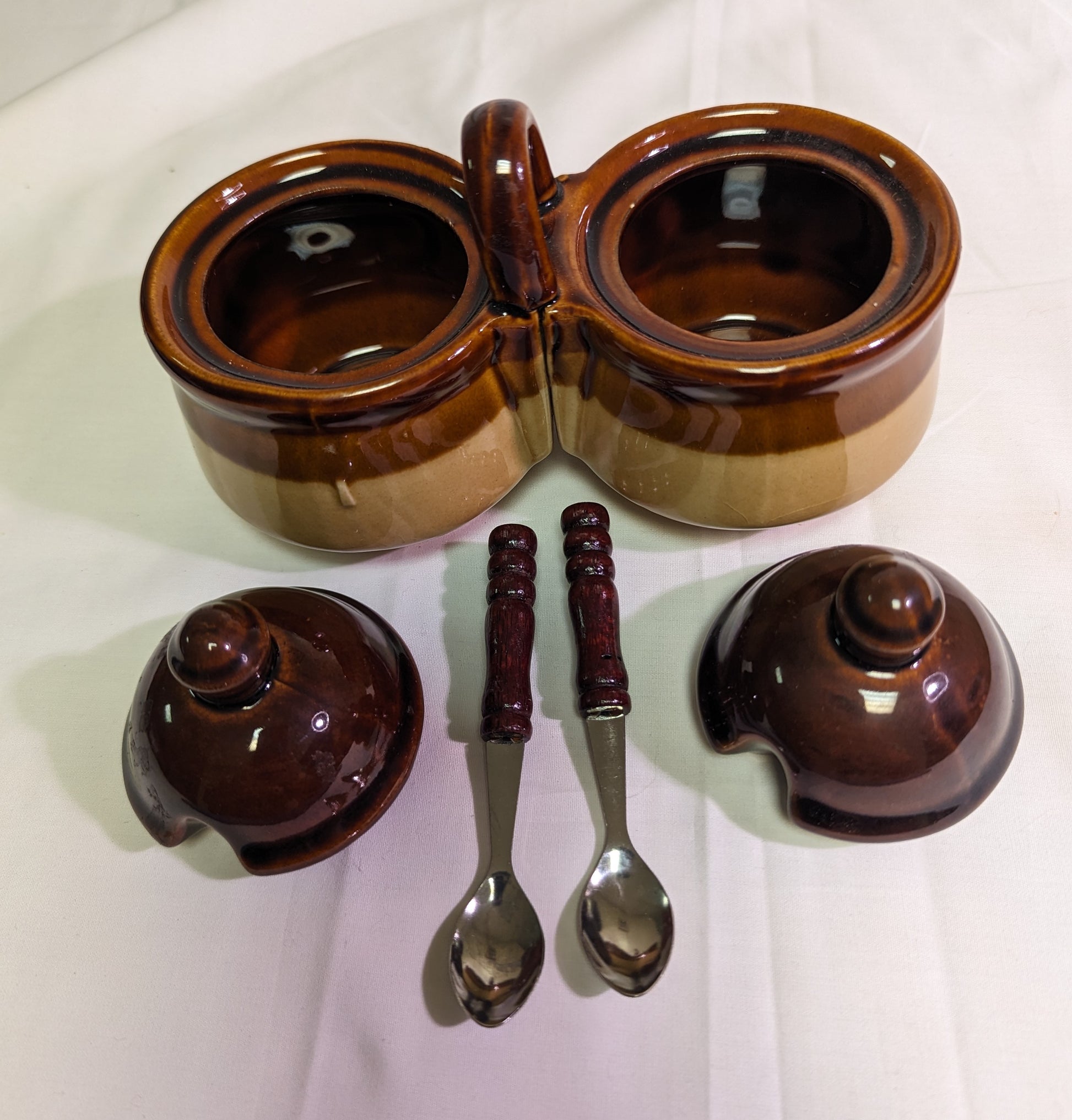 Condiment Set Vintage Houston Foods Tan and Brown Pottery Two crocks with spoons and lids.