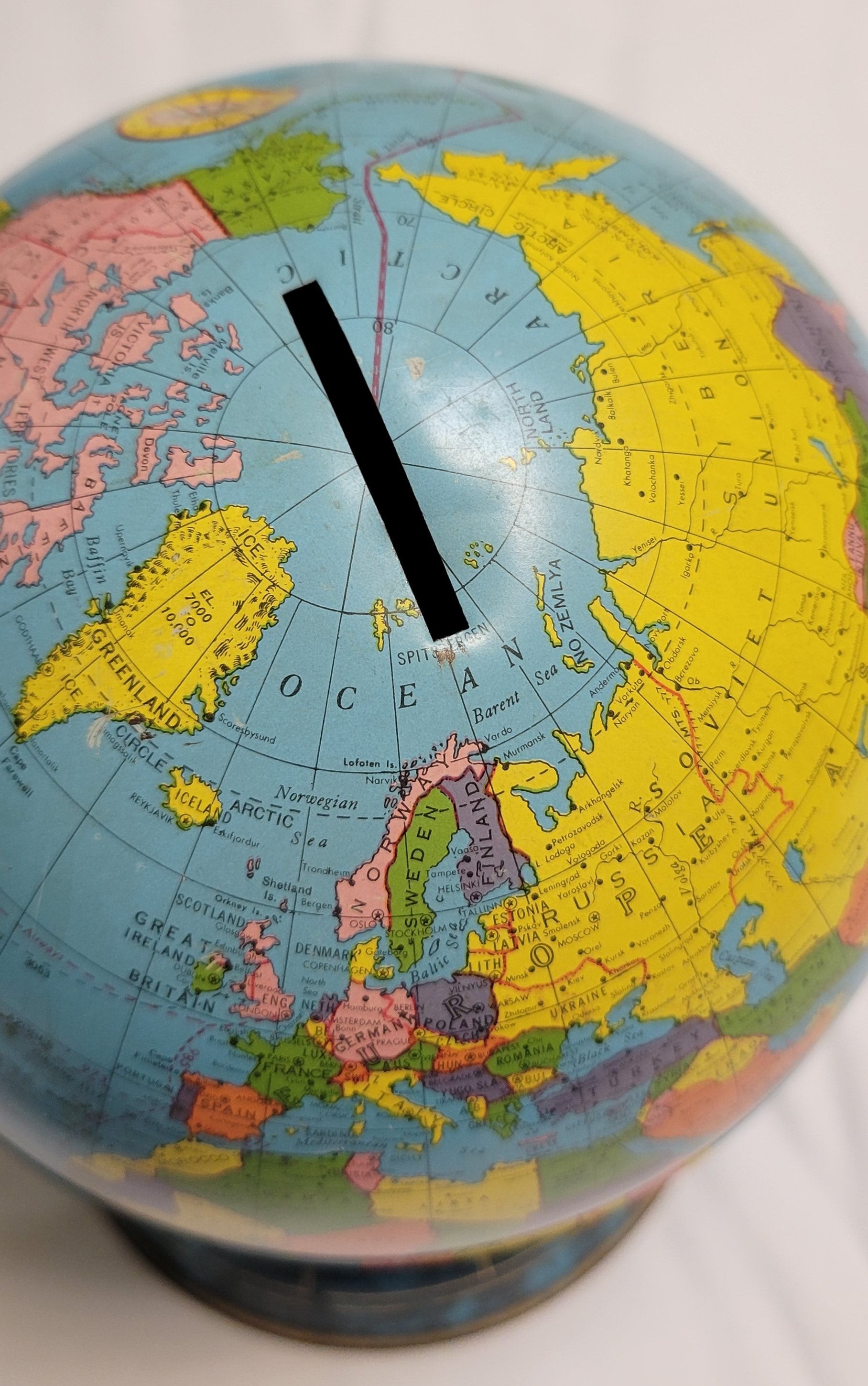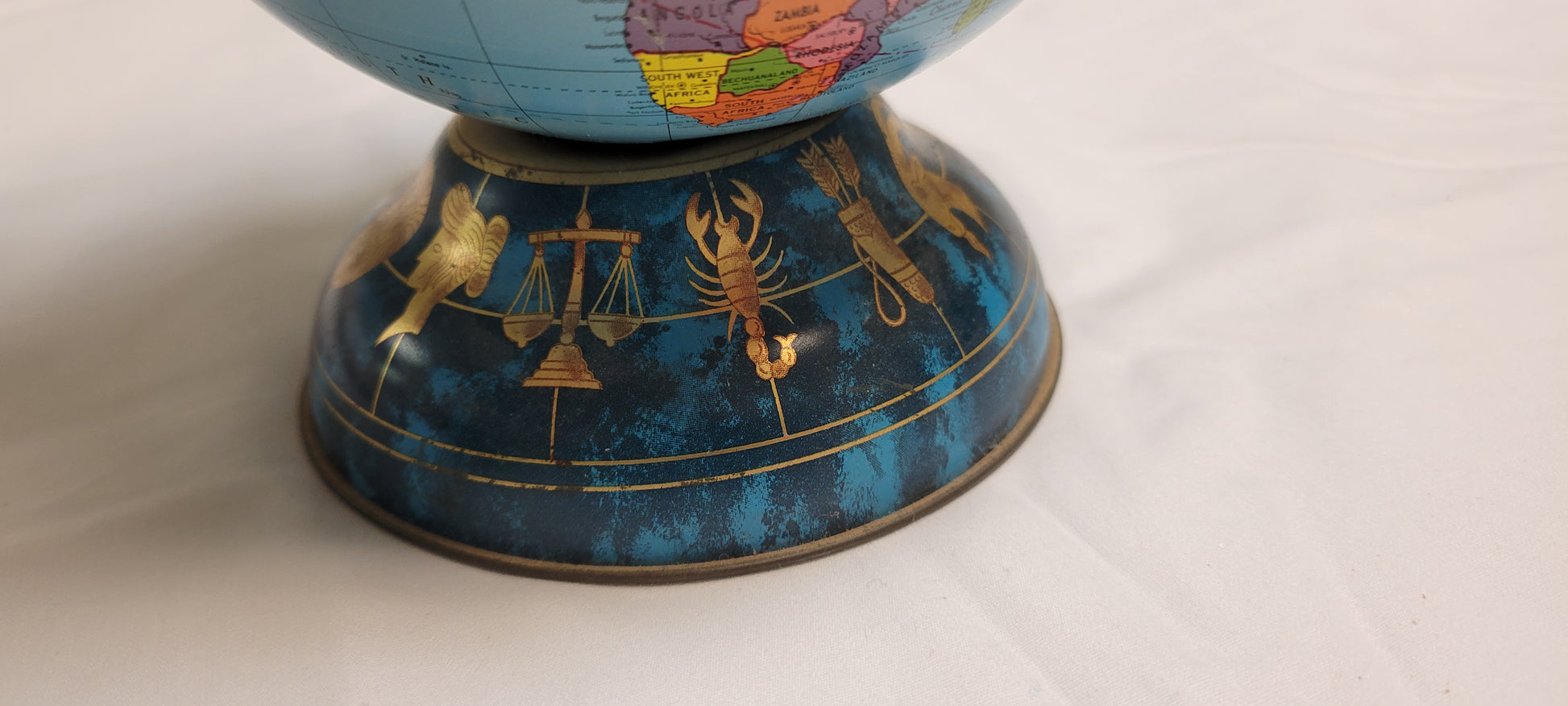 Globe Piggy World Atlas Bank, Metal Ohio Art Brand, Base with Zodiac signs