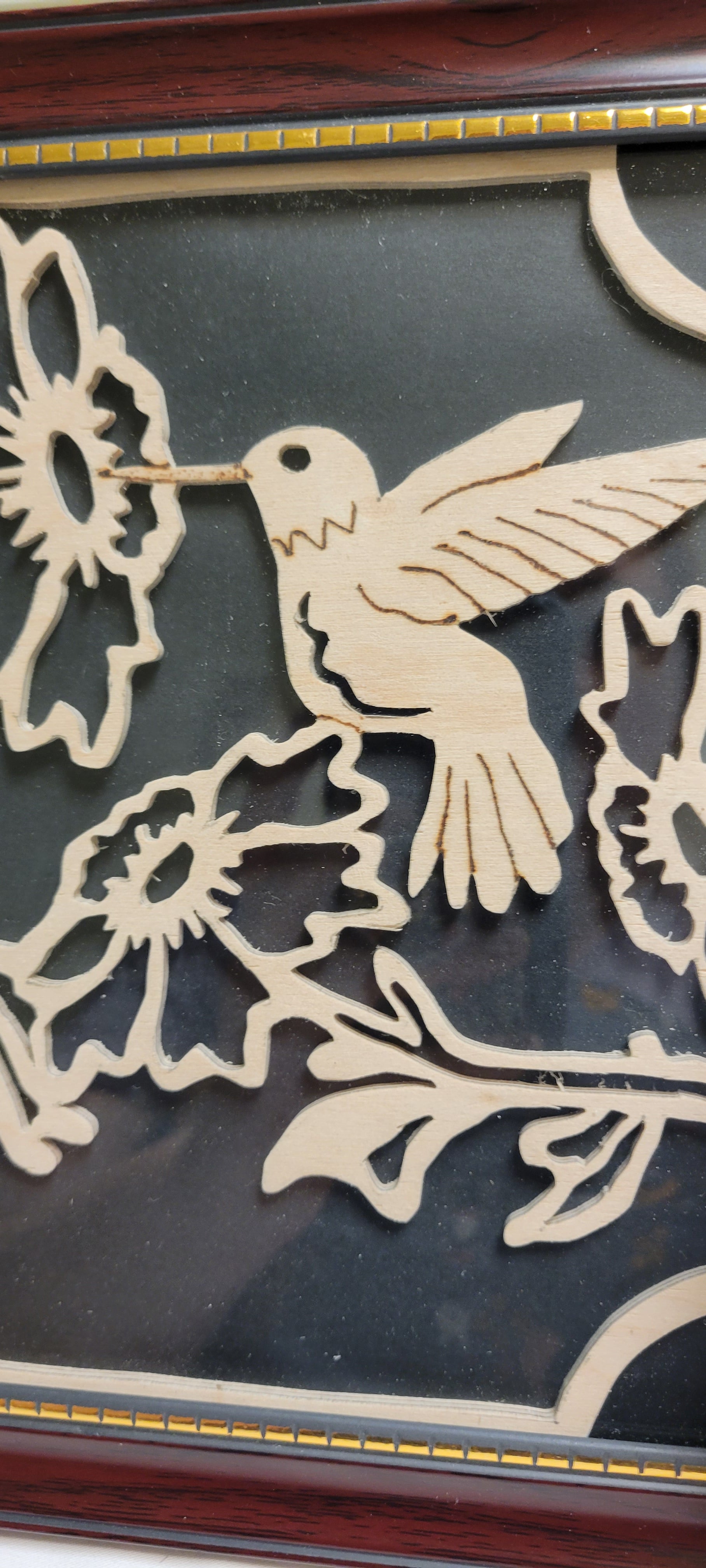 Art Scroll cut w/ Pyrography Hummingbird in Flower Framed