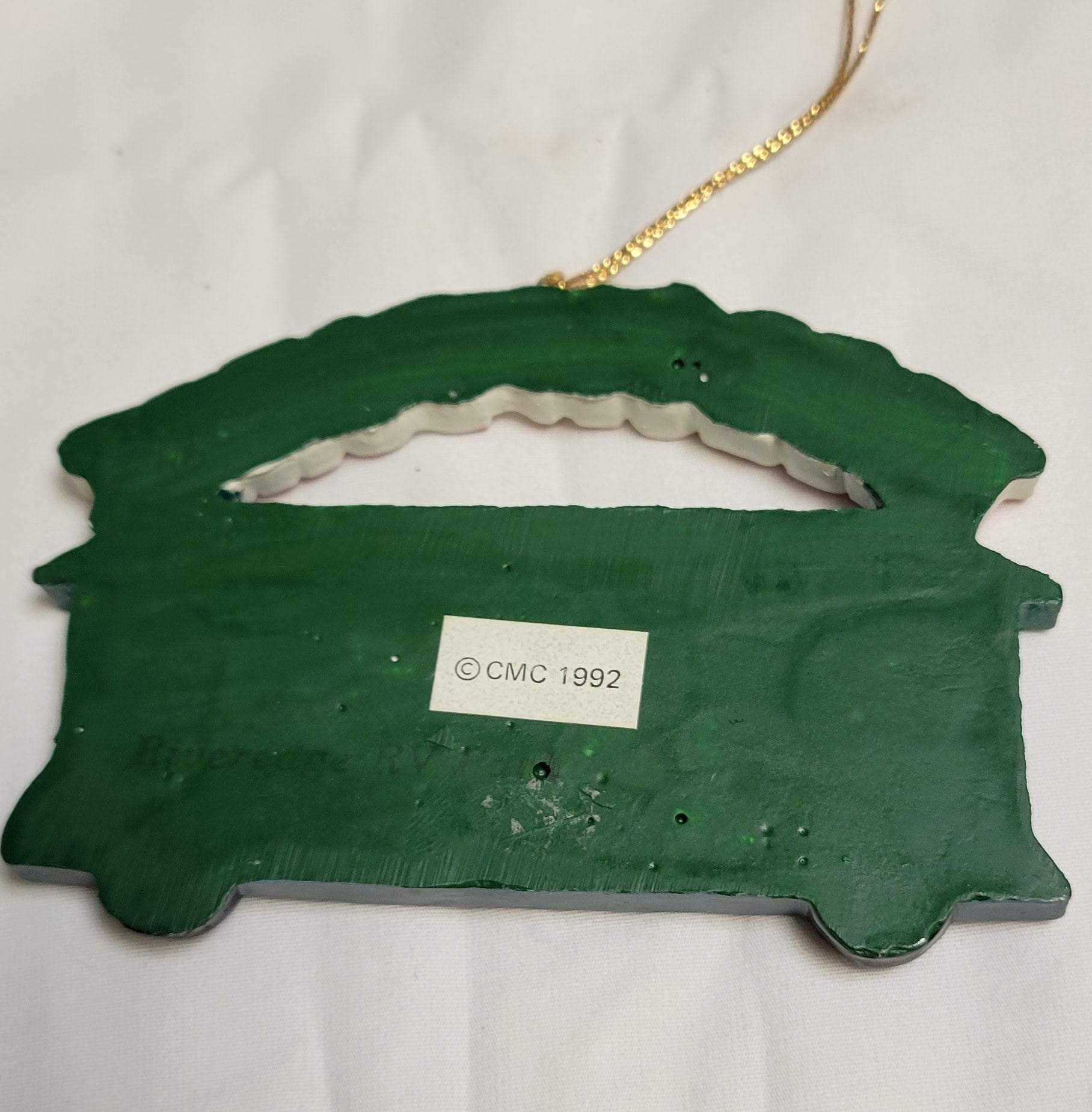 This 1992 vintage Christmas Ornament shows a Smoky Mountain Scene. About 4 inches wide, this ceramic ornament is fun addition to any collection.